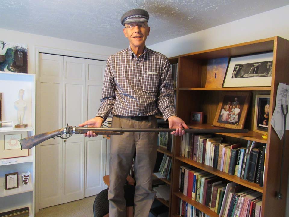 Buffalo rifle 59” octagonal barrel. Transitional form of cap and ball timing mechanism. About 1830’s. Bartholemew Malan bought it. One of the proud moments in the life of 17 year old G. H. Malan was beating a man with a new Browning rifle in a shooting match—target a Morgan dime—in about 1896. Note the marks of the ? tarred ropes used to cure the wood on the stock. The maker put his name below the cap ignition area as ASHM—the rest is below the radiator hose clasp to hold it in place.