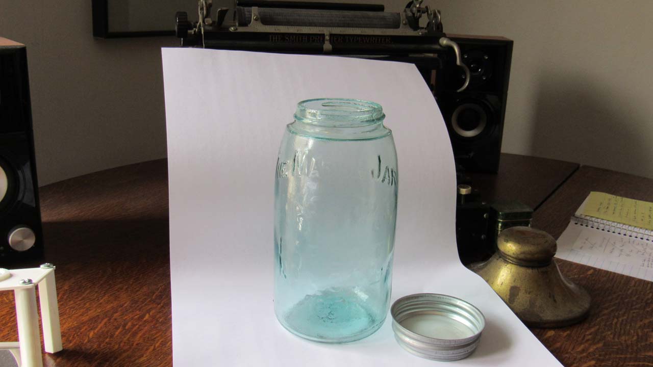 Mason Jar, bluish tint, cobalt blue. 28 on bottom, patented Nov 30 1958 on side. Lorna Cole wrote about it and her note is inside. I have a vague recollection it was found in an odd building somewhere, but its story is gone. 7 1/8” high x 3 ½” diameter.