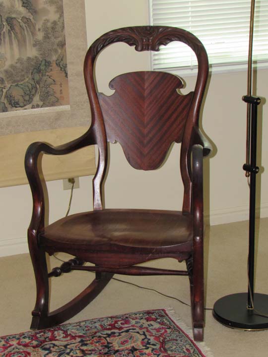 Rocker, wood, dark, with carved rose pattern on headrest 37 ¼” x 22 3/8” x 30 ¾”. Lettie Compton Malan about 1910. Lorna Compton Malan recalled standing on the seat holding the headrest and looking over the back as she made it rock in 1916 at age 3.