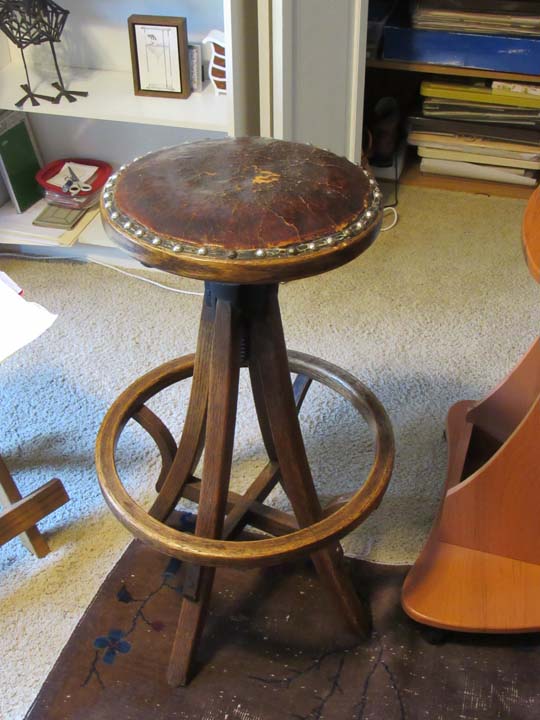 Round barstool 14” diameter with original horsehide cushion and round root rest. 28 ½” high. This was in the biology laboratory at Stanford when it opened 1891. It was sold off in 1967 and Jon Winkler cut its legs down and we refinished it together Jan 1968 during my break from internship at UCLA.