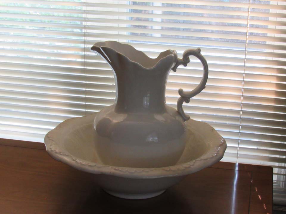Washbowl and pitcher- not a set- Pitcher by Laughlin, white, 12” high at top. Washbowl W.E.P. Co China- 16 ¼” across—Lettie Malan about 1900. Water in pitcher is poured into bowl to wash your face in the morning if your bedroom has no sink. Also G. H. Malan’s dimestore glasses lay in bowl.