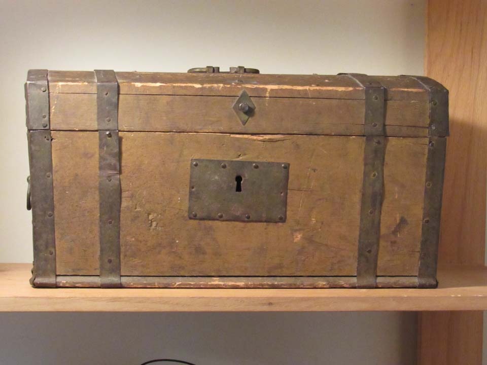 Wooden chest with metal edges and rings on sides and top 20 ½“ x 12” at bottom x 10 ¾” at center made for Joseph Compton for his handcart for the pioneer trek west. About 1855. Each handcart traveler was allowed 17 pounds of possessions. He saved and preserved his entire handcart and in my childhood it was displayed on the side of a log cabin at Temple Square.