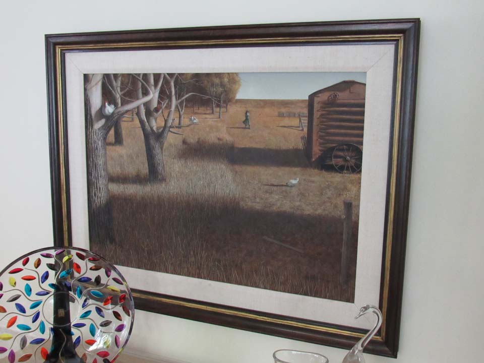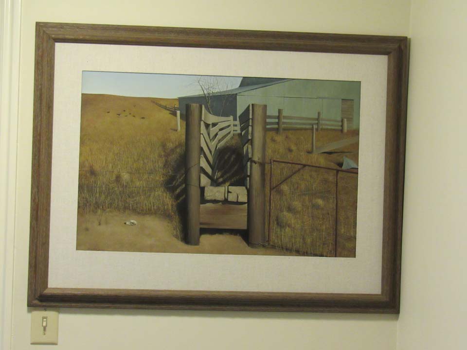 Harold Steed had 3 paintings in his office at the Clearfield Bank that were given to him as he retired. Two are by Lechmann and in value meticulous technique. The one of the girl standing in a drying aging field with chickens in the foreground who have no coop and so roost in dead trees recalls Giorgio De Chinieo with his ominous shadows. The other, of the fences that lead the cattle to the cars and then to the slaughterhouse is also haunting and sad. The essive brush strokes and detailing is exact and mciles. Pam thinks the bank decorator picked them out and not him. (it was in his office) The bison in the snow (Jim Taylor) was likely also picked out by someone else, but he would have to have chosen these options. Why? or did he ever care?