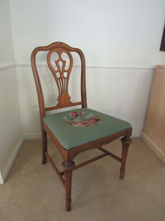 “Grandma Great” Edith Steed’s chair has roses on the seat which she did herself.