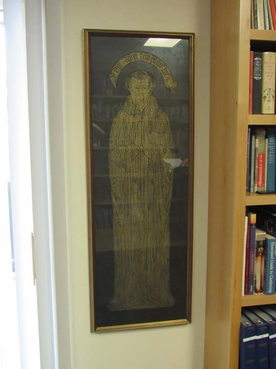 Brass rubbing of a tonsured, praying priest 3’ 6” x 11 ½”. Made for me by my friend Susan Futterman who bicycled to the church (somewhere near oxford) made the rubbing, rolled it up and bicycled back. ~1967. She was the consort of my best friend at UCLA, Robert Bland, brilliant, bipolar, bisexual who died of AIDS about 1982.